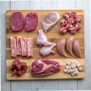 Los componentes fundamentales de la dieta BARF incluyen 60-80% de carne muscular cruda de diversas fuentes (pollo, res, cordero, pavo, pescado), 10-15% de huesos carnosos crudos comestibles (cuellos de pollo, alitas, costillas), 5-10% de órganos (especialmente hígado y riñones que son densos nutricionalmente), 5-10% de vegetales y frutas triturados o licuados para replicar contenido estomacal de presas, y ocasionalmente huevos enteros, lácteos fermentados o suplementos específicos.
