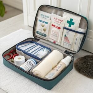 Un botiquín bien equipado facilita primeros auxilios para perros y gatos efectivos durante emergencias. Los componentes esenciales incluyen gasas estériles (múltiples tamaños para diferentes heridas), vendas autoadhesivas (no requieren cinta adhesiva), cinta médica, vendas elásticas (para inmovilizar extremidades lesionadas), tijeras de punta roma y pinzas de punta fina (para remover astillas o objetos extraños superficiales).